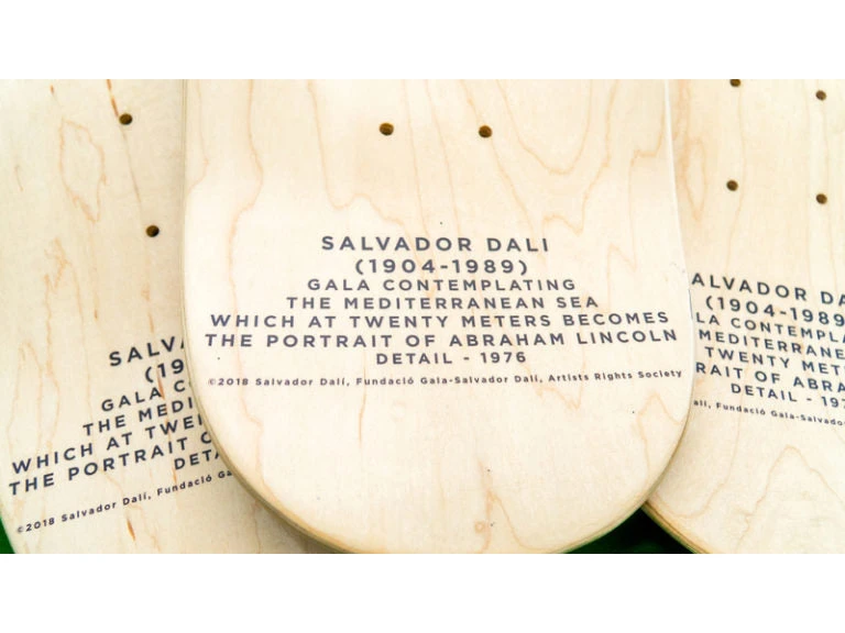 this exclusive limited edition of 100 Salvador Dali Skateboard Triptych features his iconic work Gala Contemplating the Mediterranean Sea which at Twenty Meters Becomes the Portrait of Abraham Lincoln (Homage to Rothko) made in 1976. This explicit and long title provides a perfect description of the original painting (oil and collage on canvas). Standing close, we see the Spaniard Surrealist artist, Salvador Dalí’s wife Gala with her back turned to us, looking toward the rising sun over the Mediterranean Sea. Represented with a heavy impasto application, Dalí depicts a vision of Christ crucified ascending into heaven seen from above (Christ’s head is the glowing sun). When we stand further back, we see that the area of the sky, behind Gala’s figure, is in the shape of a cross. As the title suggests, if we stand further back (twenty meters away) we see that the shapes and small color fields around Gala and the background of the artwork turn into a Portrait of Abraham Lincoln. As the title suggests, Dalí made this work as a homage to the Leading Abstract Expressionist artist Mark Rothko, who began to explore to surrealism at the beginning stages of his career. Rothko abandoned figurative art for color-field, value relationships, and basic geometric shapes, as an exploration of the sublime, immersive experience of an artwork. Dali’s multiple blocks of colors in the varying progression of hues ending in a dark perimeter is evocative of the meditative color fields found in Rothko’s works.