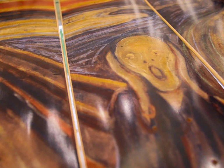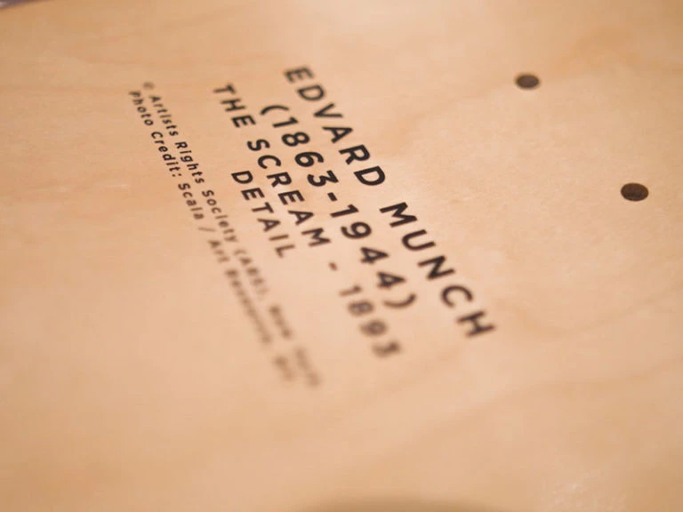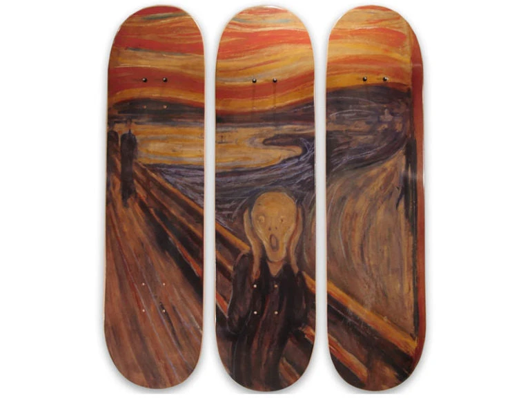 Bringing together tradition and contemporary culture, Musart Boutique is proud to present our exclusive original collection Musart on Decks featuring limited edition skateboard decks, displaying art historical timeless masterpieces which bridge the traditional history of art and contemporary skateboarding culture at accessible prices. Part of Musart Boutique’s original collection Musart on Decks comes this exclusive limited edition of 100 Edvard Munch Skateboard Triptych features his iconic work The Scream (1893). The Norwegian symbolist artist Edvard Munch’s iconic series of four versions of his work titled “Der Schrei die Natur” (the scream of nature) popularly known as “The Scream”. Three of the original four versions made as both tempera and pastels are currently found at the National Gallery in Norway, however, one of the four versions in pastel was auctioned in 2012 at Sotheby’s Impressionist and Modern Art auction to a private collector for nearly $120,000,000, making it the second highest price achieved at that time by a painting at auction. In a diary entry by Edvard Munch dating to January 22, 1892 the artist states: “I was walking along the road with two friends – the sun was setting – suddenly the sky turned blood red – I paused, feeling exhausted, and leaned on the fence – there were blood and tongues of fire above the blue-black fjord and the city – my friends walked on, and I stood there trembling with anxiety – and I sensed an infinite scream passing through nature.” Edvard Munch’s “Scream” is often described as a representation of the existentialist feelings and moods characterizing the nineteen-century Fin-de-siècle period. Like Leonardo da Vinci‘s Mona Lisa, Edvard Munch’s The Scream is one of the most iconic artworks in the history of art with its androgynous figure, skull-shaped head, elongated hands, wide eyes, flaring nostrils, and open mouth, which has now been ingrained forever in our collective cultural consciousness.