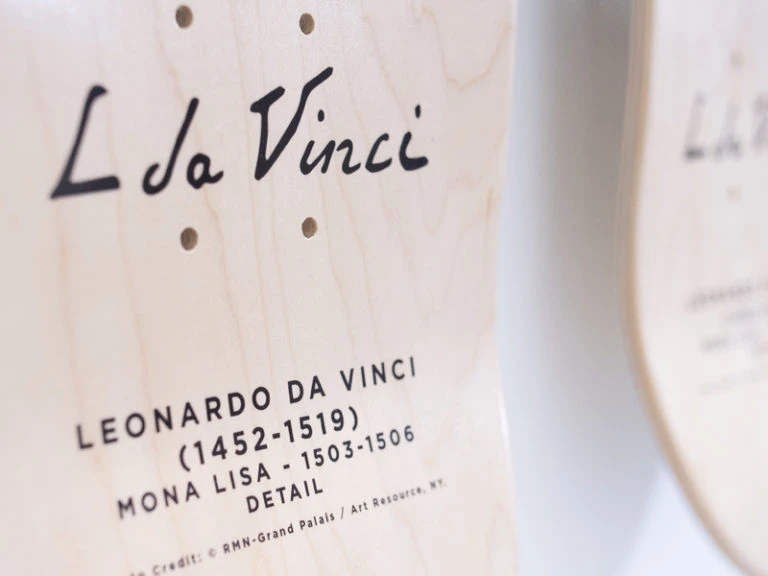 This exclusive Leonardo da Vinci skateboard triptych features the timeless masterwork of the Italian High-Renaissance master’s Portrait of Lisa Gherardini, also known as the Mona Lisa (1503). Currently located at the Musée du Louvre in Paris, Leonardo’s Mona Lisa is the world’s most famous portrait and one of the History of Art’s most popular works, identified by the art historian Giorgio Vasari as Lisa di Antonio Maria Gherardini, wife of a wealthy Florentine merchant, Francesco del Giocondo. The uniqueness of Leonardo’s Mona Lisa resides in the lack of jewelry or lavish attributes that would identify the sitter as an aristocratic woman. Although Renaissance etiquette dictated women must never look directly into a man’s eye, Leonardo masterfully empowers the sitter with a self-assuring gaze immediately directed at the viewer. The Mona Lisa is represented sitting at a logia, in front of a mysterious uninhabited landscape through which the viewer evidences Leonardo’s fascination with atmospheric perspective and his traditional use of sfumato which influenced artists for ages to come.