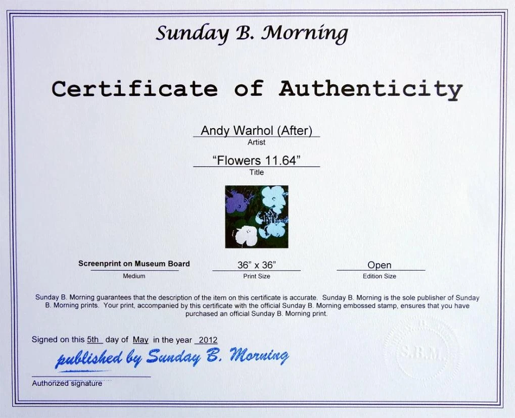 Sérigraphie sur papier cartonné de musée après Andy Warhol et publié par Sunday B. Morning. Inscriptions au dos : « Publié par Sunday B. Morning »et « Remplissez votre propre signature ». Ces estampes se trouvent dans » Feldman & Schellmann’s « .Andy WarholCatalogue Raisonne ». Certificat d’authenticité délivré par Sunday B. Morning inclus
