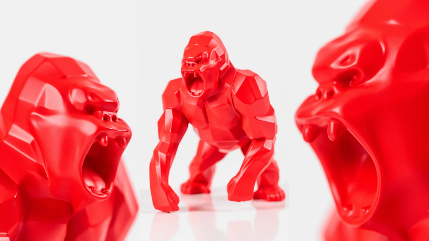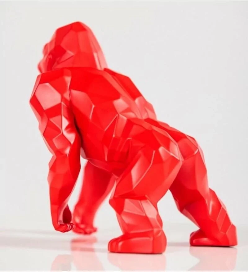 Alors, en 2010, Richard Orlinski sculpte Wild Kong, son premier Kong à facettes en résine, debout, martelant son torse de ses poings. Depuis, l’artiste ne cesse de transformer son Kong : brandissant un baril de pétrole, vêtu comme un boxeur ou un joueur de football, doté des attributs des Super héros, dans la position du Penseur de Rodin… Cette fois, Richard Orlinski nous livre sa vision du Kong originel, du Kong légendaire. Même gueule, même corps musclé facetté que les précédents, mais à la position debout, le sculpteur a substitué une attitude d’animal sauvage. Kong prend appui sur la plante de ses pieds et sur une main repliée. Prêt à bondir, Kong redresse la tête et nous interpelle pour mieux nous éblouir. Pour la première fois, l’Artiste adopte une finition mate pour son rouge emblématique.