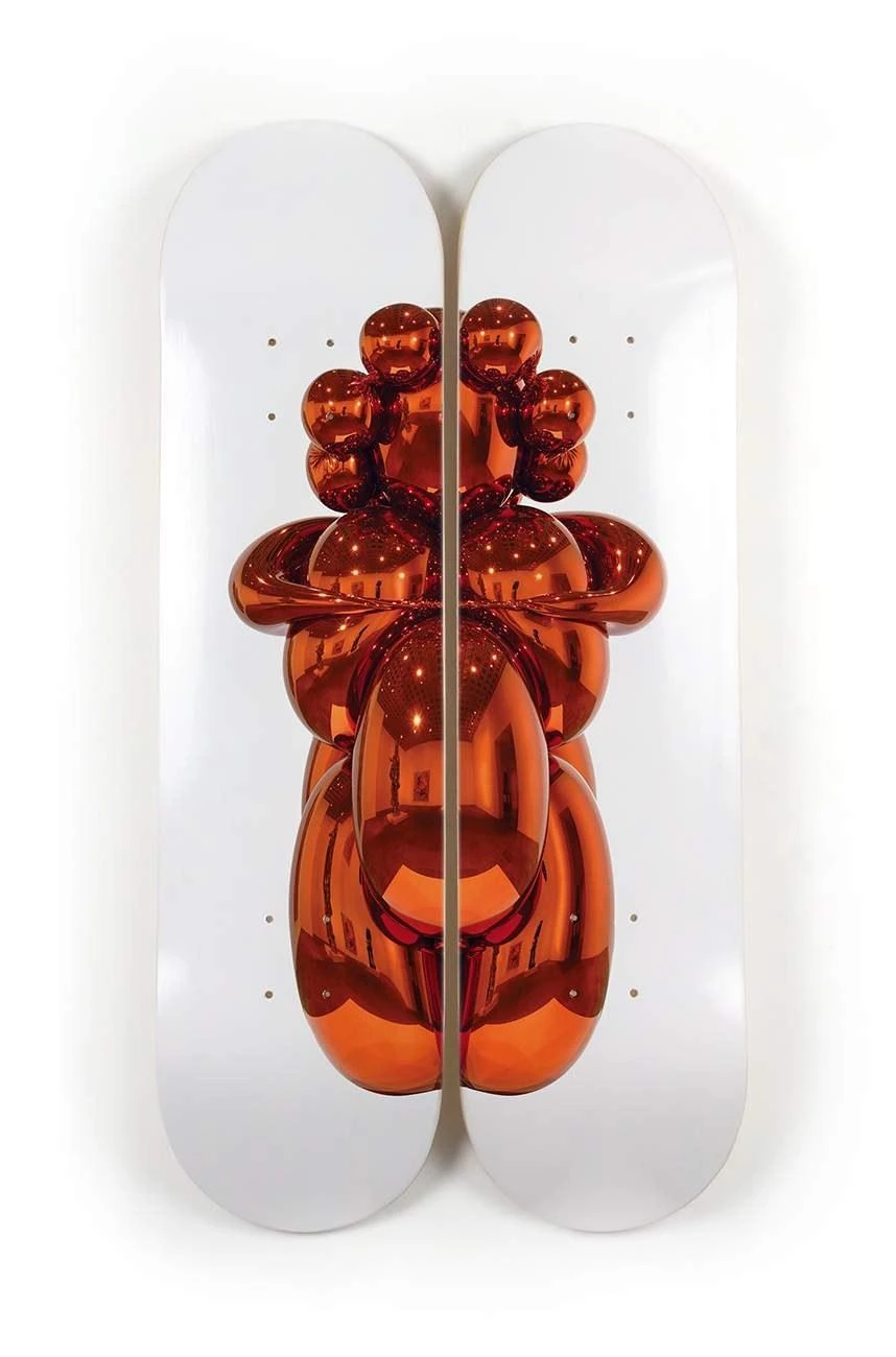 Internationally recognized American-artist, Jeff Koons is paying homage to the Venus of Willendorf in his Balloon Venus Skateboard. In his Antiquity series, Koons reimagined the ancient limestone figurine as a balloon. The venus is transformed into a large-scale reflective stainless steel sculpture in a contemporary way but reinvisioned for today. Here we see the piece appear on skateboards presented as a diptych.